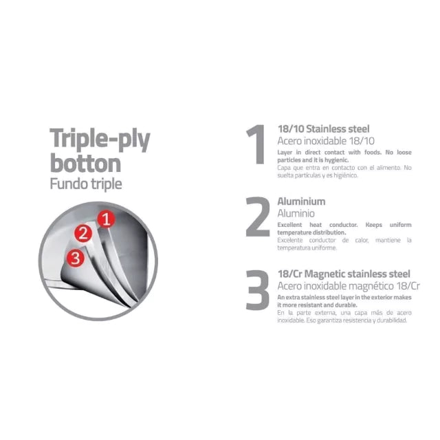 La gastronomía puede ser su hobby o su profesión, incluso las dos cosas, pero para preparar las mejores recetas es necesario de ollas que atiendan sus necesidades y que tengan alto desempeño. El Sartén Tramontina raso de acero inoxidable fondo triple con mango 30 cm de diámetro 2,9 L de la línea Professional es la mejor opción para quien busca realizar mucho más en la cocina. Su fondo triple (acero inoxidable + aluminio + acero inoxidable) fue desarrollado para distribuir el calor uniformemente, proporcionando una cocción rápida y por igual de los alimentos. Además, puede usarse en la cocina y en el horno para finalizar, lo que facilita más la ejecución de las preparaciones. Ahora puede hacer lo que le encanta sin preocupaciones y sin estrés, solo aprovechando el sabor y aromas de una buena receta.