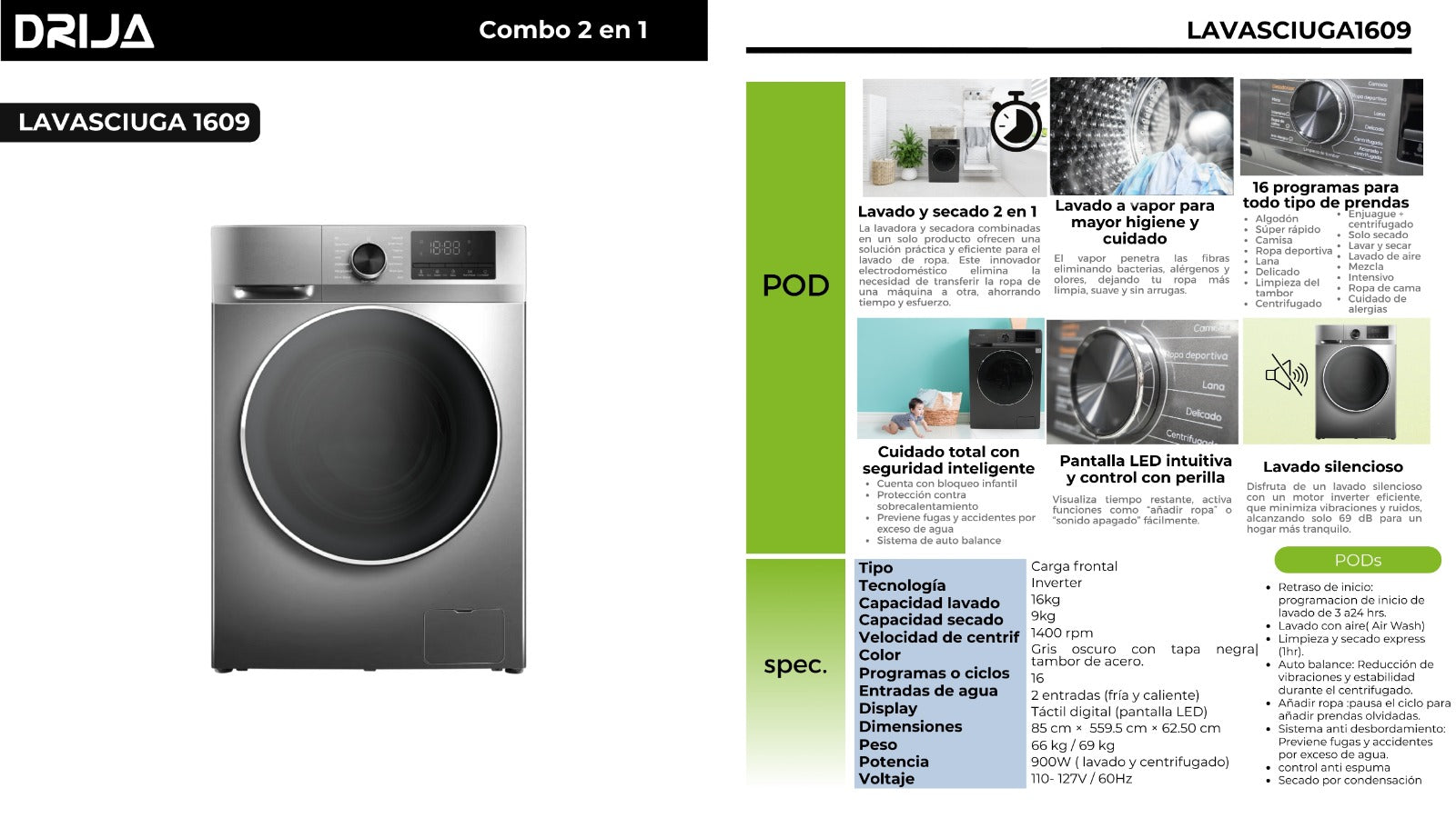 Lavadora y Secadora Inverter 16kg Lavado y 9kg Secado Drija Lavasciuga 1609