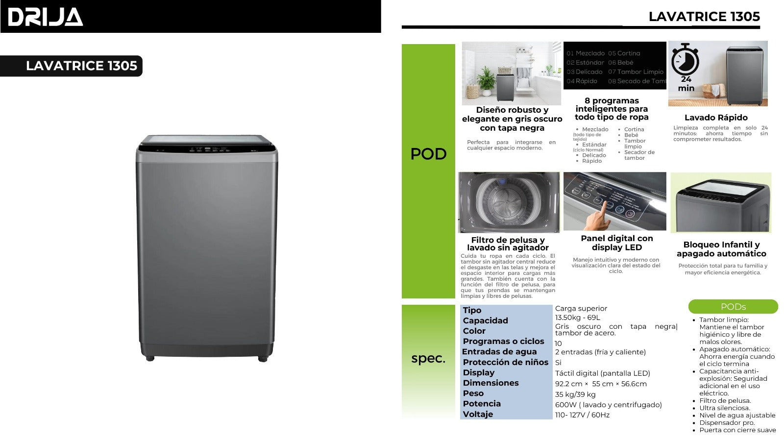 Lavadora Automática de 13.5kg/69L Drija Lavatrice 1305