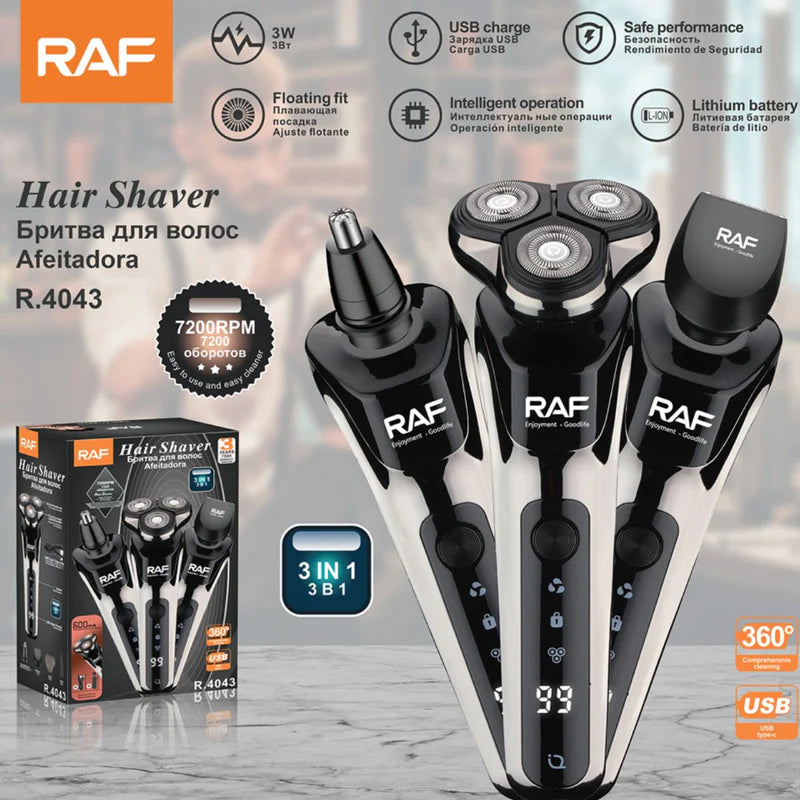 - Diseño 3 en 1 multifuncional: incluye afeitadora rotativa, recortadora de precisión y perfilador de nariz y orejas.