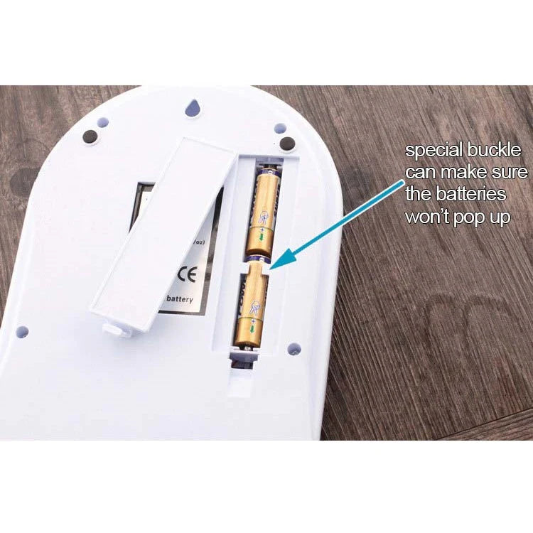 La báscula funciona con 2 pilas AAA (incluidas) con un compartimento de batería de fácil acceso y un apagado automático de 2 minutos para conservar la duración de la batería.