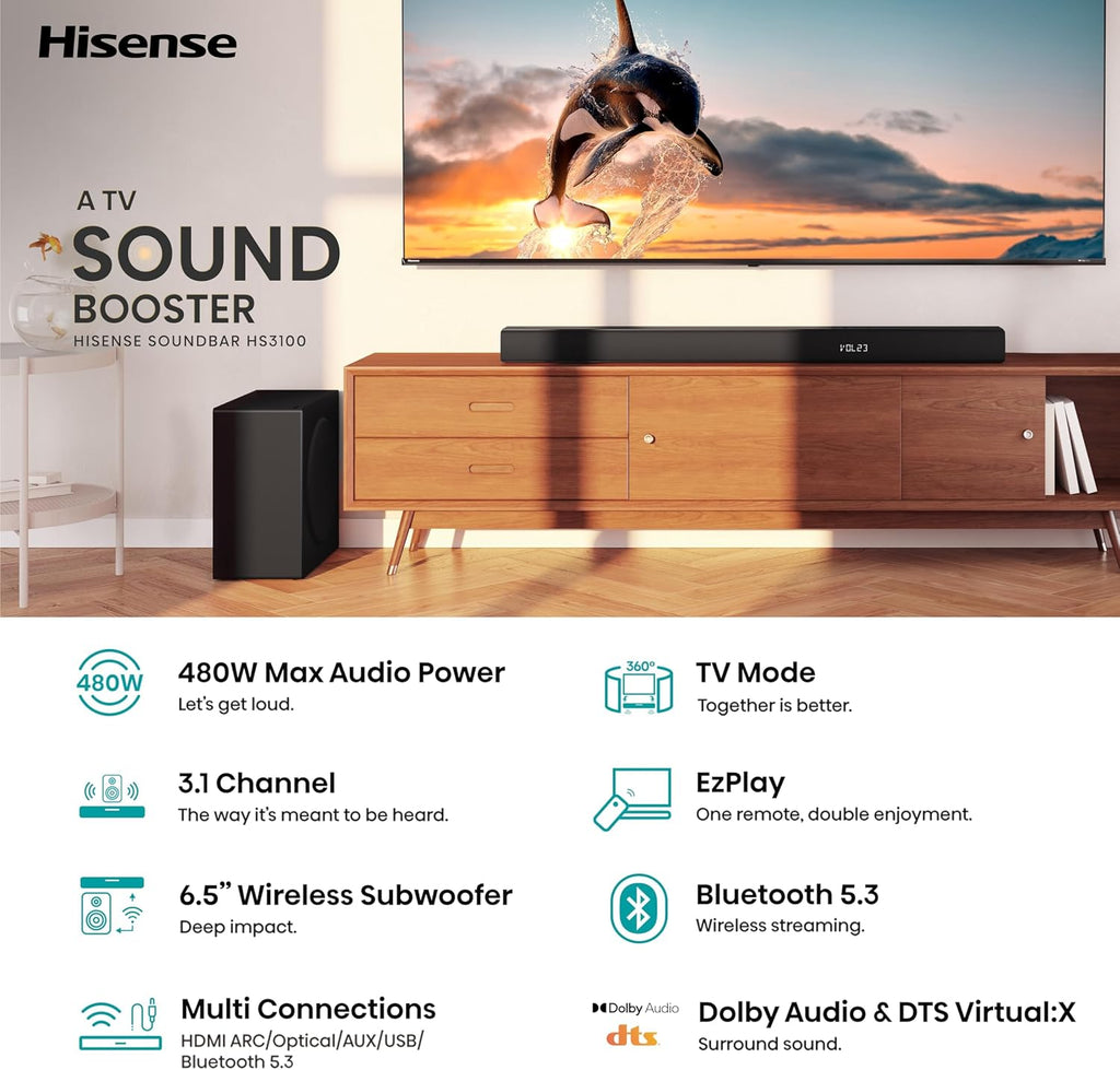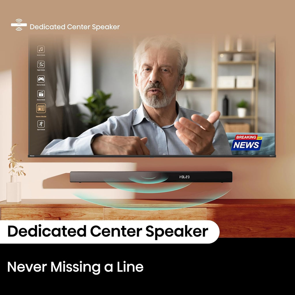 Modo TV: con la tecnología de modo TV, cuando se empareja con Hisense TV, puedes disfrutar de todo el potencial del motor de sonido de tu televisor a través de los altavoces de la barra de sonido para mejoras de audio inmersivas.