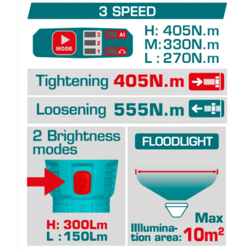 Combo Total Llave de Impacto Inalámbrica 20V con Luz de Trabajo y Accesorios. POCAS UNIDADES