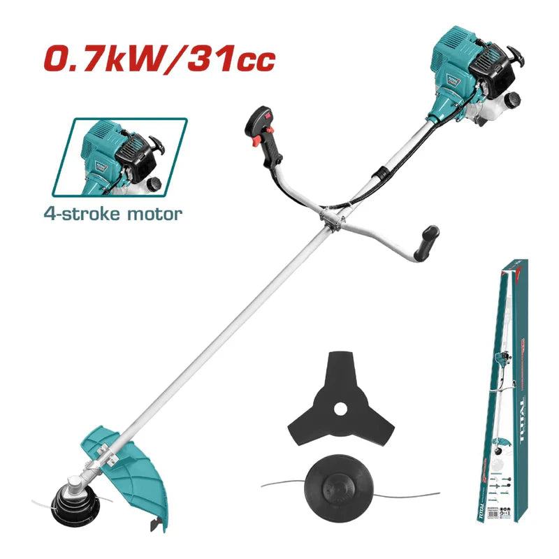 Desmalezadora guira grande. Motor 4 tiempos enfriado por aire a gasolina 0.7KW (1.1HP) 31cc. Dos funciones para hierba y arbustos.
