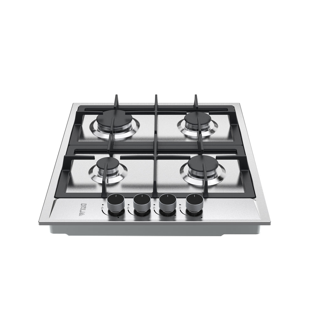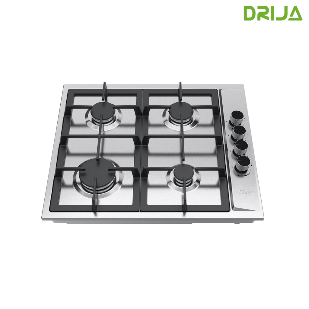 Estufa empotrable de 60 cm con cubierta en acero inoxidable y parrillas de hierro colado. Ofrece 4 quemadores de diferentes intensidades, sistema de válvulas de seguridad y diseño compacto ideal para cocinas funcionales y modernas.