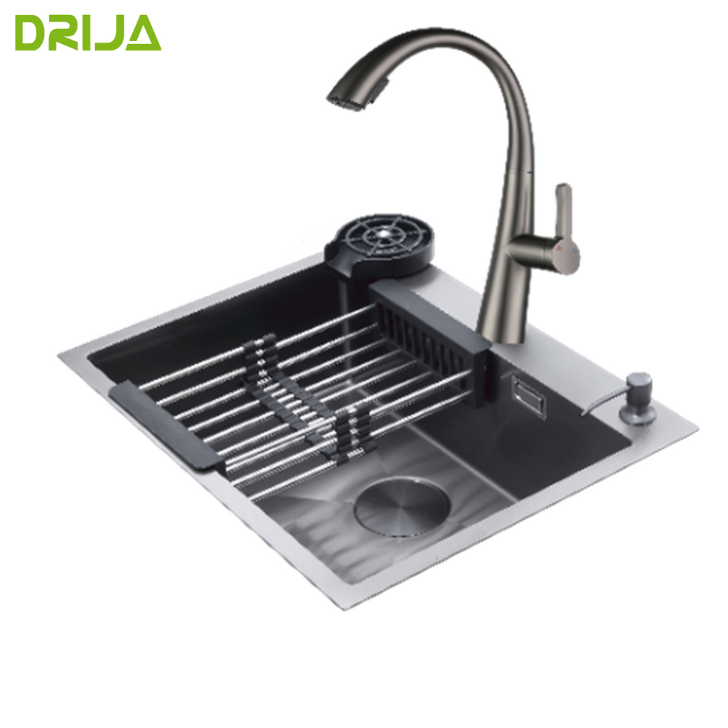 FREGADOR DE 76.2 CM DE LUJO, ACERO INOXIDABLE SATINADO 304, ESPESOR DEL BORDE 3MM. ACCESORIOS: DRENAJES Y KIT COMPLETO DE INSTALACIÓN, CESTA EXTRAIBLE EN EL DRENAJE, TAPA DE DESAGUE DE LUJO, ESCURRIDOR DE 114 MM CON TUBO DE 1,5'', GRIFERÍA BLACK DE LUJO MONOMANDO CON MANGUERA EXTRAIBLE, SISTEMA ANTIRREBOSO, SISTEMA ANTIRUIDO, ENJUAGADOR DE VASO, DISPENSADOR DE JABON DE 500ML. MEDIDAS 762*508*220MM.