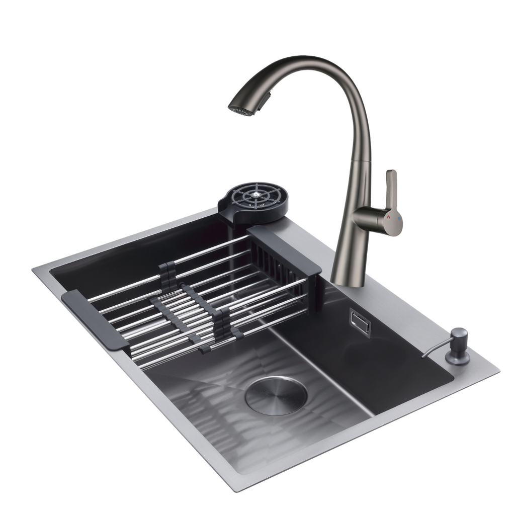 Añade elegancia y funcionalidad con nuestros fregaderos de acero inoxidable. Disponibles en diversos modelos, estos fregaderos incluyen un dispensador de jabón, grifo de alta calidad, enjuagador de vasos, cesta extraíble para utensilios y un tubo de desagüe, ofreciendo una solución completa para tu cocina.