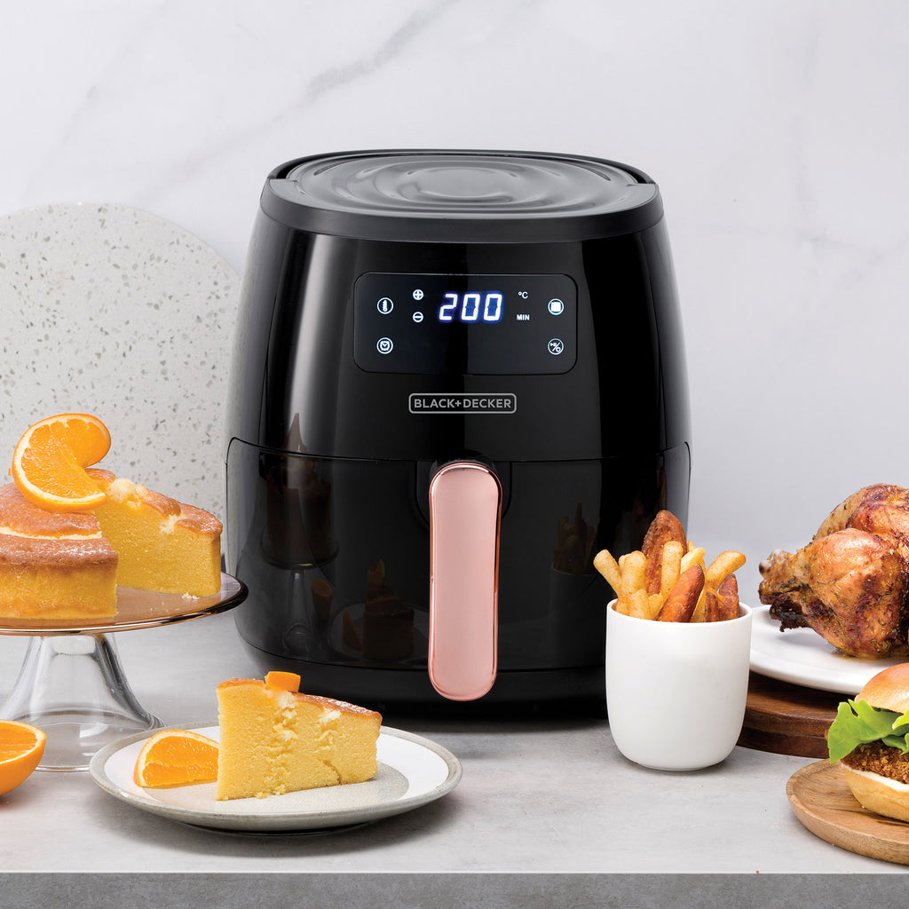 Freidora de aire digital Black and Decker HFD5055B, es extragrande de 5.7 litros, para cocinar porciones para toda la familia. Fríe y hornea con aire de manera saludable con poco o nada de aceite. La freidora de aire Black and Decker tiene pantalla digital táctil, con 7 funciones automáticas para mayor comodidad y rapidez. Puedes freír sin aceite: papas fritas, costillas, camarones y pescados, pollo y más. También puedes asar carnes, así como también hornear cupcakes, brownies y pasteles. La freidora de aire Black and Decker tiene una cesta antiadherente y desprendible, ideal para lavavajillas y una limpieza rápida y fácil.