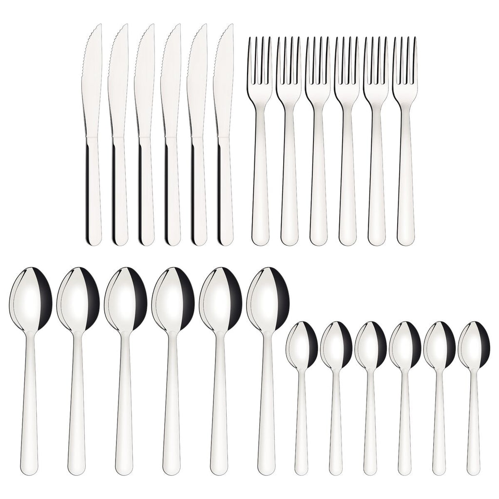 Cubiertos fabricados en acero inoxidable que mantiene la belleza, la higiene y la durabilidad. Láminas de los cuchillos tienen más durabilidad del filo, gracias al tratamiento térmico. Tenedores y cucharas que garantizan mayor resistencia, gracias al espesor del acero y al estampado de las láminas. Se pueden llevar al lavavajillas facilitando tu día a día.