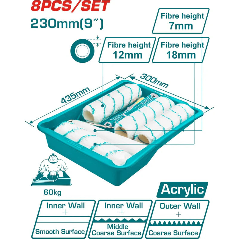 Juego de Rodillos para pintar 8 en 1 con bandeja de pintura. Para Interiores y Exteriores. 1 Rodillo 230 mm (9''). Espesor 7mm. 3 Rodillos 230 mm (9''). Espesor 12 mm. 1 Rodillo 230 mm (9''). Espesor 18 mm. 1 Rodillo 230 mm (9''). Espesor 7mm. 1 Soporte para Rodillos de 230 mm (9''). 1 Pincel de Diseño de 25 mm (1''). 1 Bandeja de 435 x 300 x 75 mm.