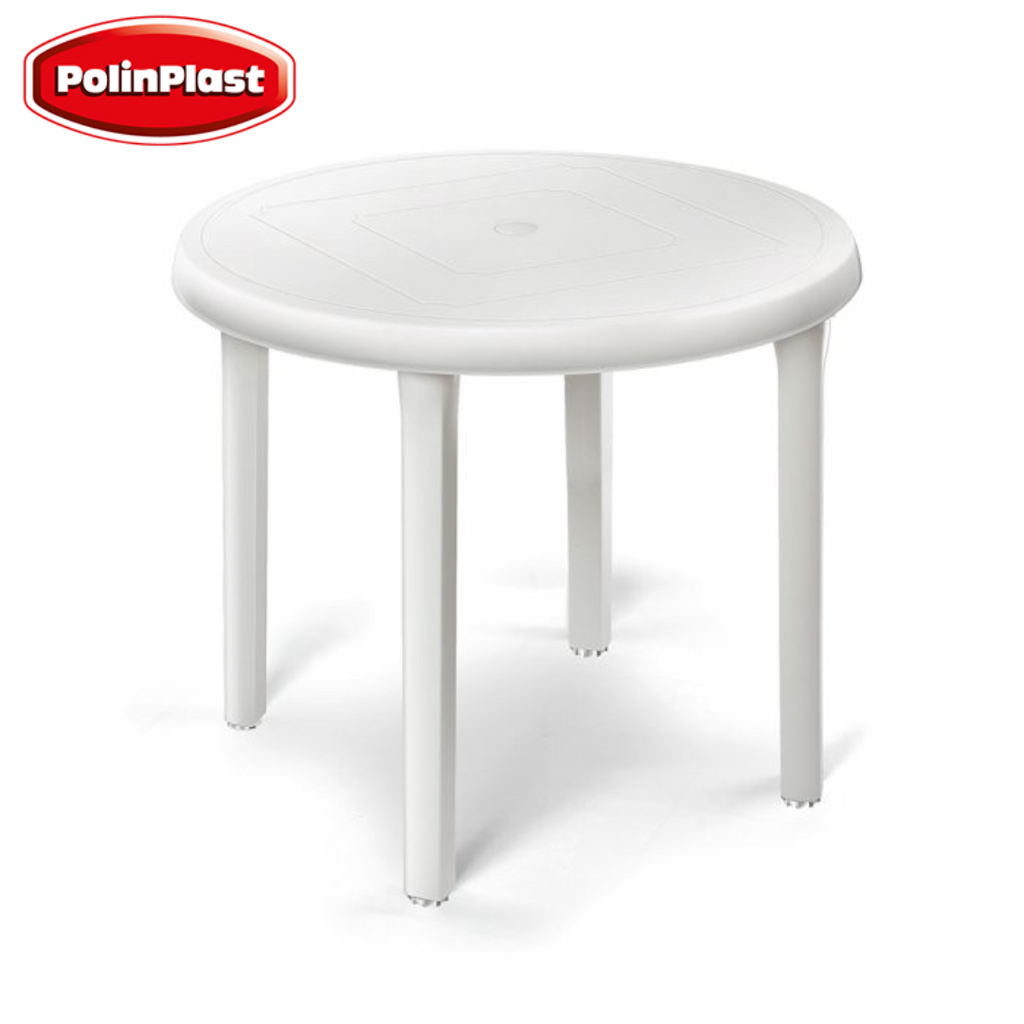 Mesa plástica redonda súper resistente y durable, desarmable, lista para llevar y colocar en cualquier lugar y espacio; ideal para la playa, jardín, piscina, cocina o negocio. Viene con patas antideslizantes y reguladores de altura para mejor estabilidad.