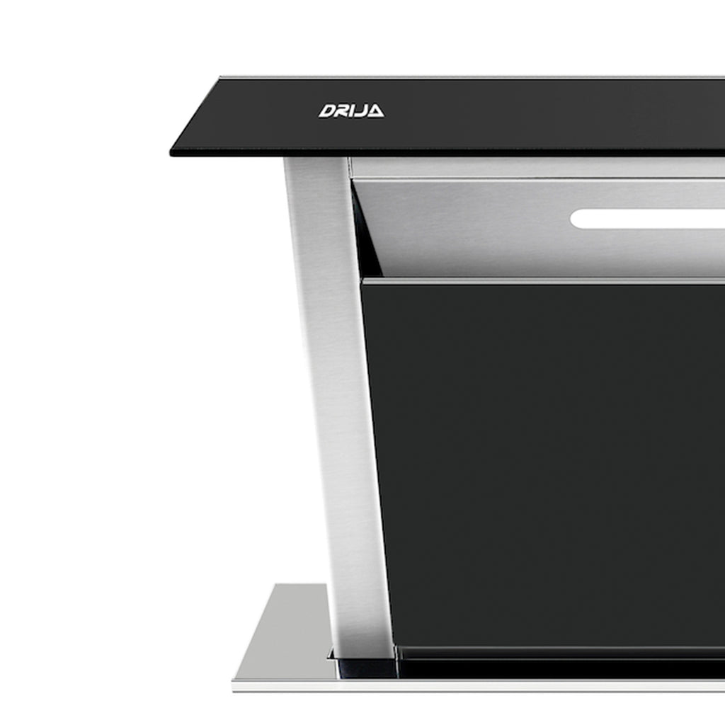 Campana extractora tipo isla de 90 cm con diseño minimalista y ascendente. Cuenta con panel deslizable táctil, apertura automática, 8 niveles de velocidad y barra LED que garantiza una visualización perfecta al cocinar.