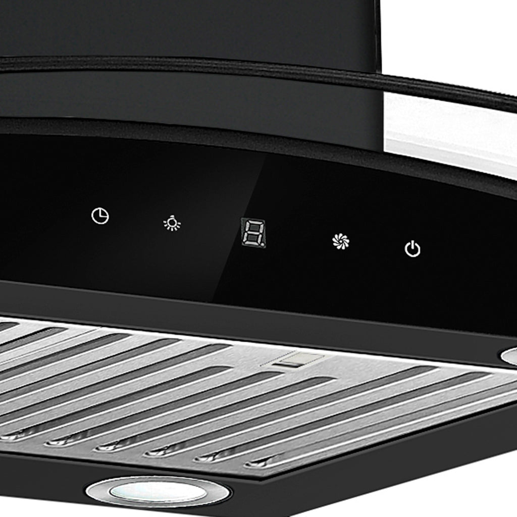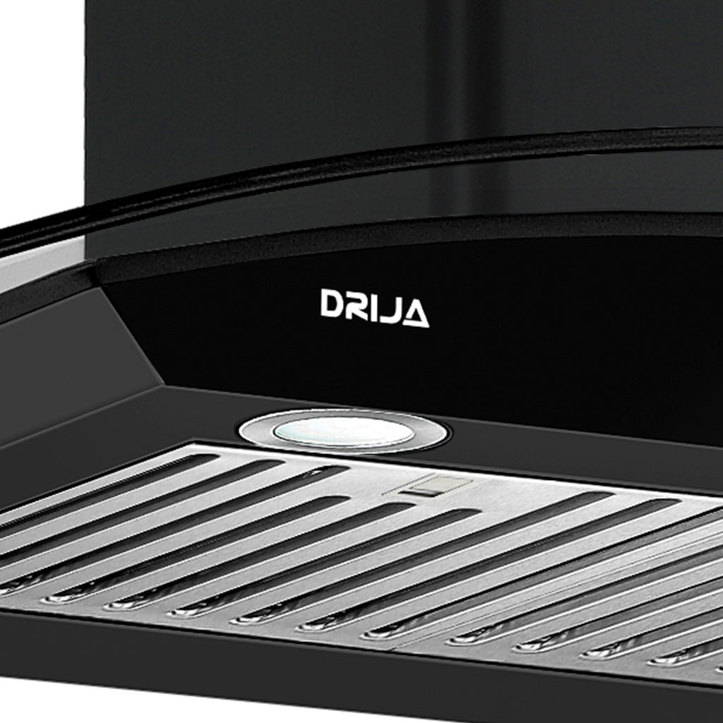 Campana extractora tipo isla de 90 cm con diseño elegante y curvo. Equipada con panel digital, filtro de carbón, sistema de filtración múltiple y 4 luces LED. Ideal para espacios abiertos, con extracción potente y silenciosa.