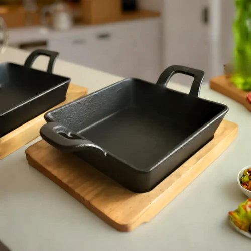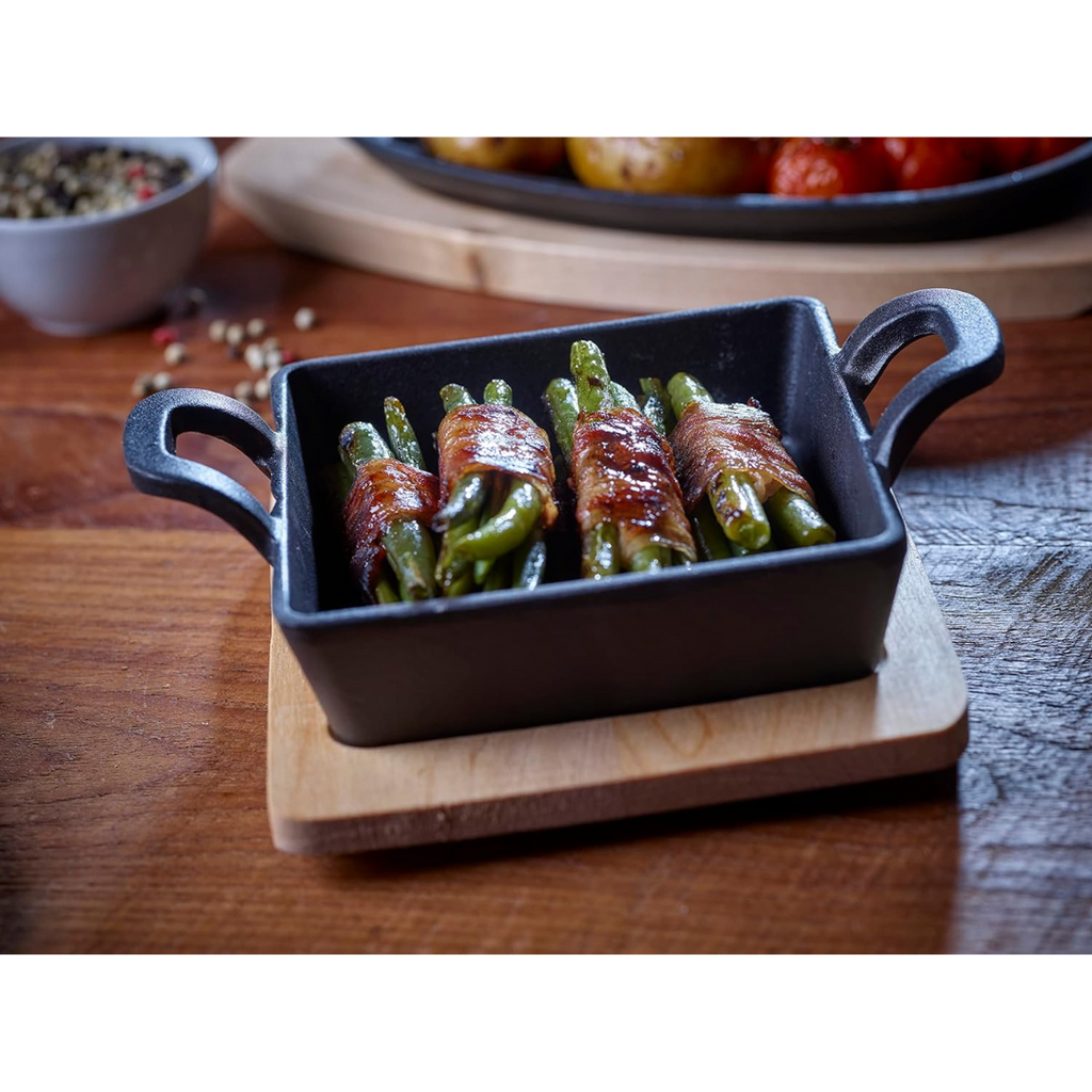 Mini Sartén de Hierro Fundido con Bandeja de Madera 18x12x3.5cm 86051
