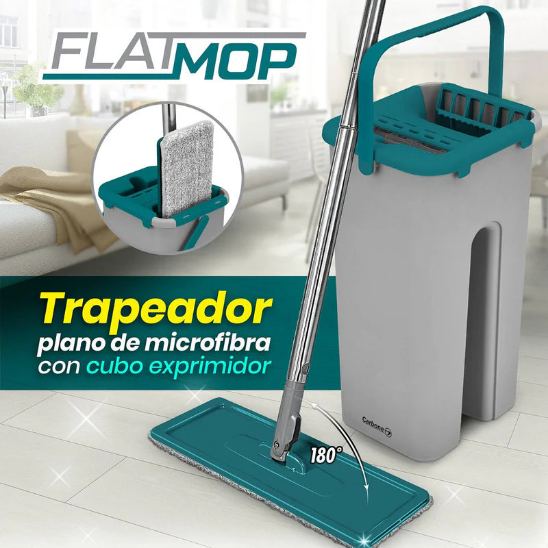 Trapeador Flat Mop Plano de microfibra con Cubo Exprimidor.
